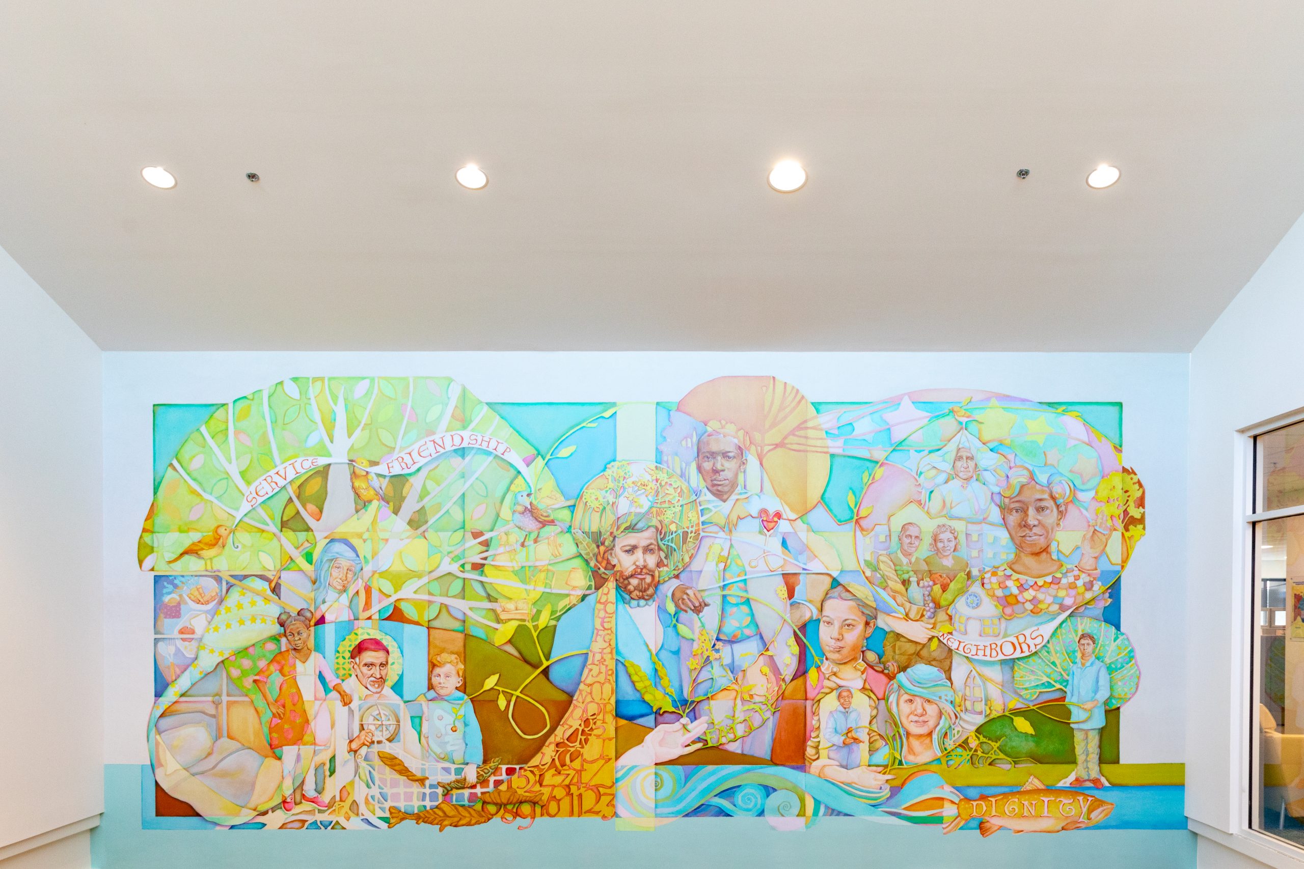 Artist: Tina Westerkamp; "Vincentians" in chronological order, left to right; focus on service, friendship, neighbors, dignity; date not identified