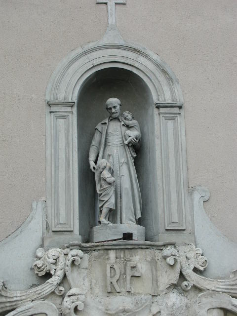 Stone statue in niche; Vincent de Paul, standing, cassock, mantle, skullcap, with two children; original on facade of (probably) former Daughters of Charity institution, Carcassonne