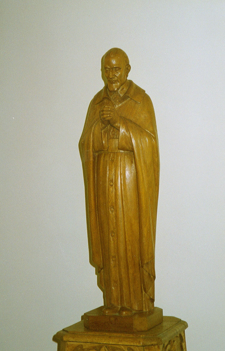 Carved wood, Vincent de Paul, cassock with large buttons, cape; hands clasped in prayer; original in Daughters of Charity house, La Chesnay