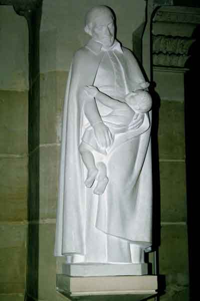 Marble (?); Vincent de Paul, standing, cassock, cape, skullcap, holding child loosely in his arms; original in parish, Lamotte-Beuvron