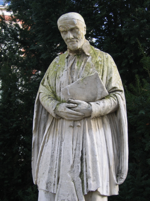 Outdoor marble statue, Vincent de Paul, cassock, surplice, stole, skullcap; holding book, hands crossed; original in Lycee St Bernard, Chatillon sur Seine, internet imageGroupe scolaire St. Vincent, St. Bernard
