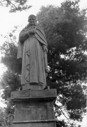 B/W photograph; Vincent de Paul, standing, cassock, cape, holding crucifix; original at Notre Dame de Marceille, Limoux