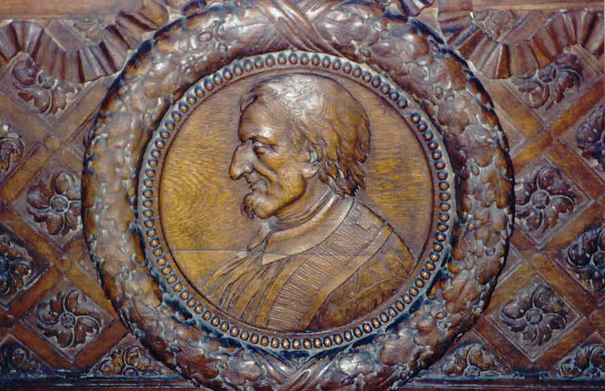 Carved wood, altar frontal, Vincent de Paul bust in profile, long nose, cassock, surplice, stole; original in former Vincentian parish in Versailles