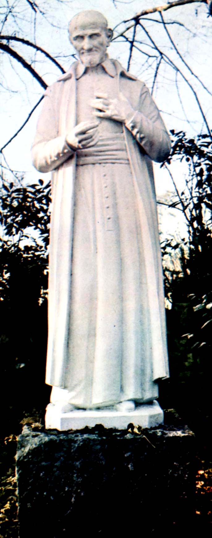 Stone statue, Vincent de Paul, standing, clothing modeled on originals in Paris: partial buttons on cassock, sleeves; gesturing; original in Buglose