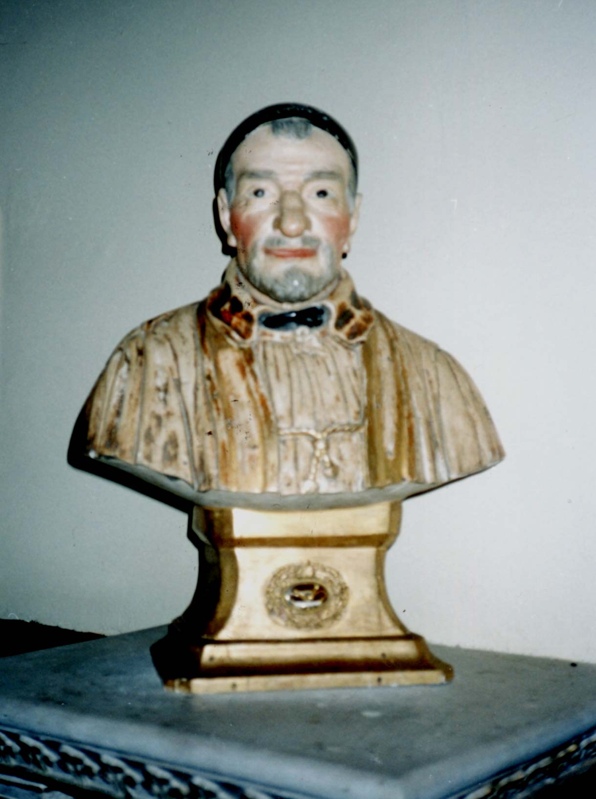 Wood, painted, gilded; Vincent de Paul bust, cassock, surplice, stole, skullcap; with relic in base; original in Notre Dame de Grace chapel, near Buzet-sur-Tarn