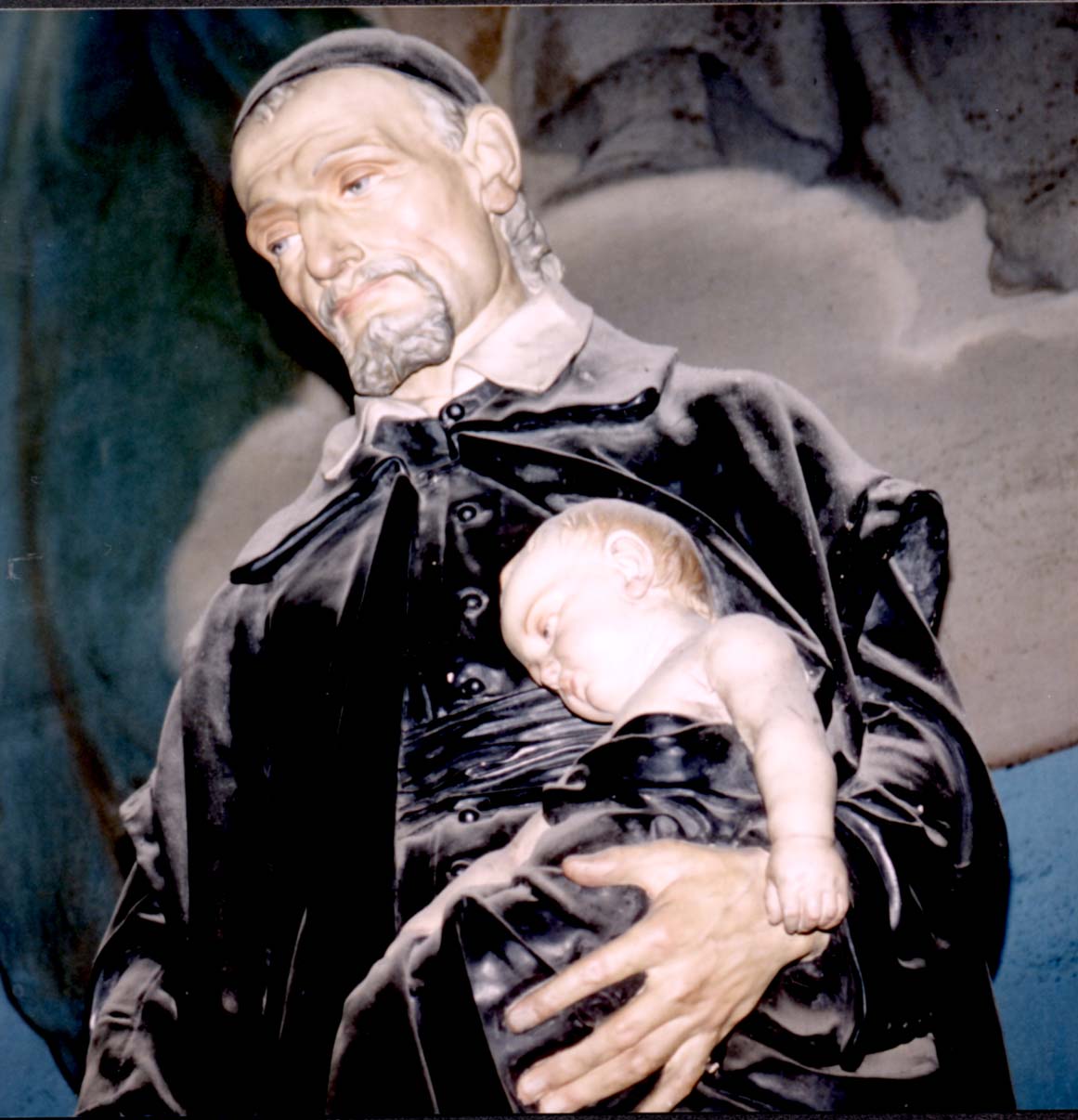 Vincent de Paul, standing, cassock, mantle, skullcap, holding sleeping child; detail of original in Ste Anne, Amiens
