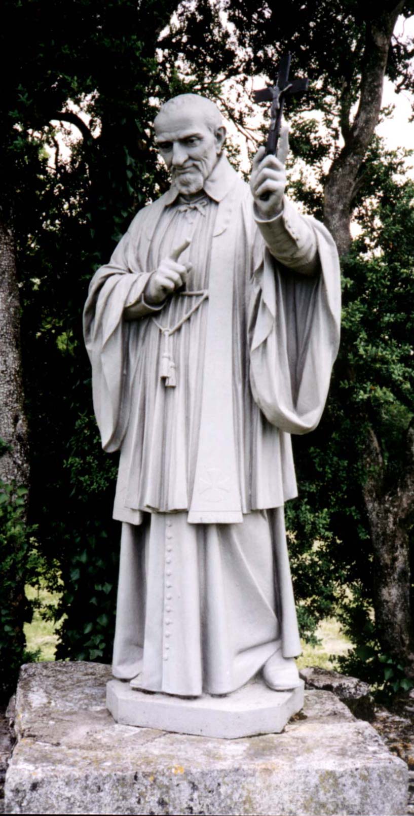 Cast iron, painted; Vincent de Paul, standing, cassock, surplice, stole, holding crucifix; outdoors at Le Puech, Montgesty