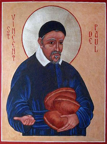 Icon, cassock, cincture, mantle, skullcap, halo, holding loaves of bread; name at side written vertically; original in Phibsboro parish, Dublin; artist: Fearghal O'Farrell, Sept. 1999