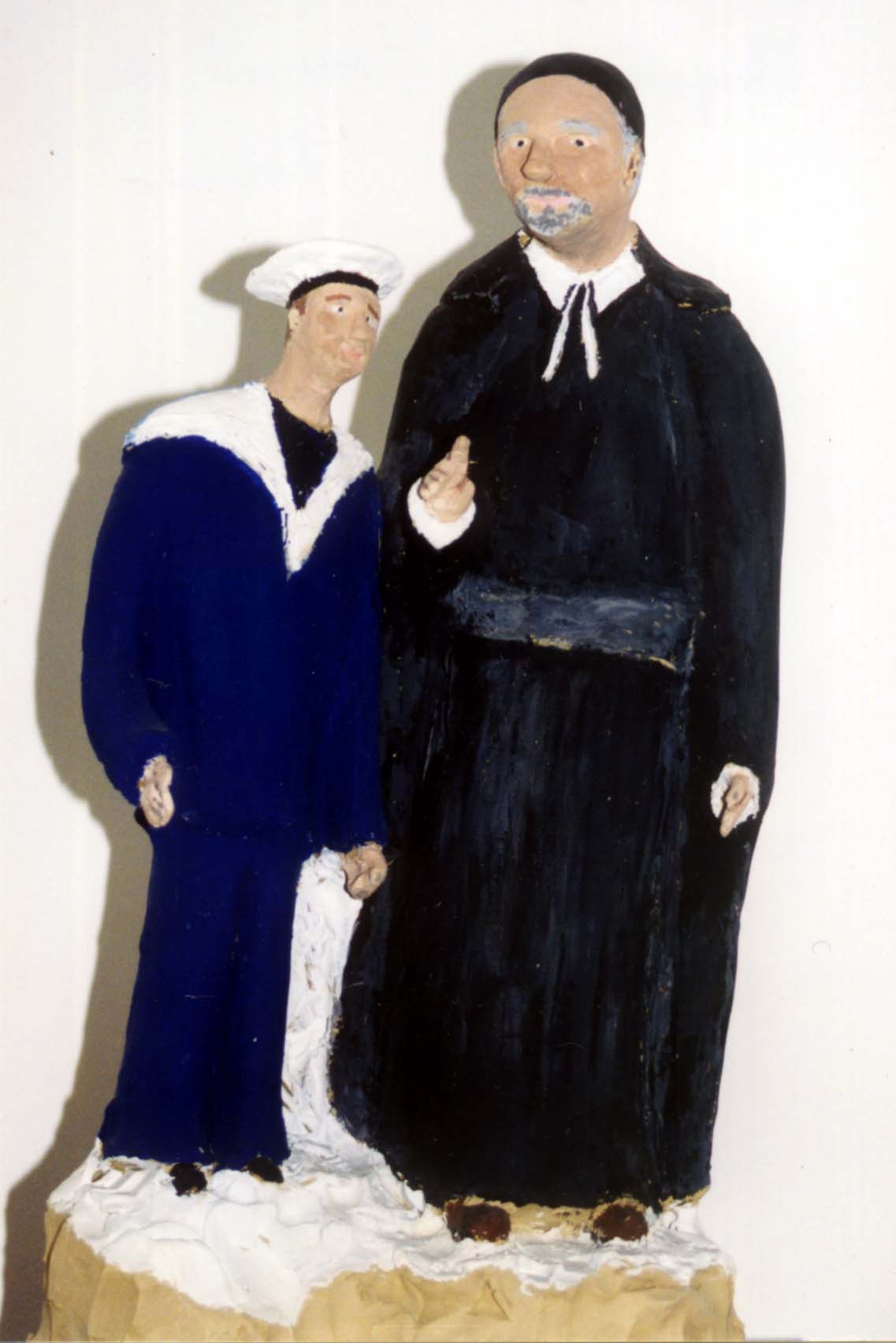 Paper maché (?), painted statues, Vincent de Paul, standing, cassock, surplice, mantle, skullcap; sailor in blue uniform; original in Toulon
