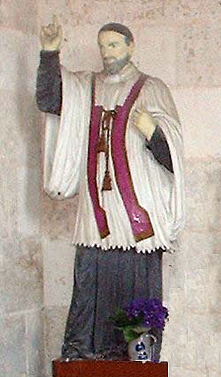 Plaster statue; Vincent de Paul, standing, cassock, surplice, violet stole, skullcap, hand raised in preaching gesture; crucifix missing from left hand; original in church, Folleville