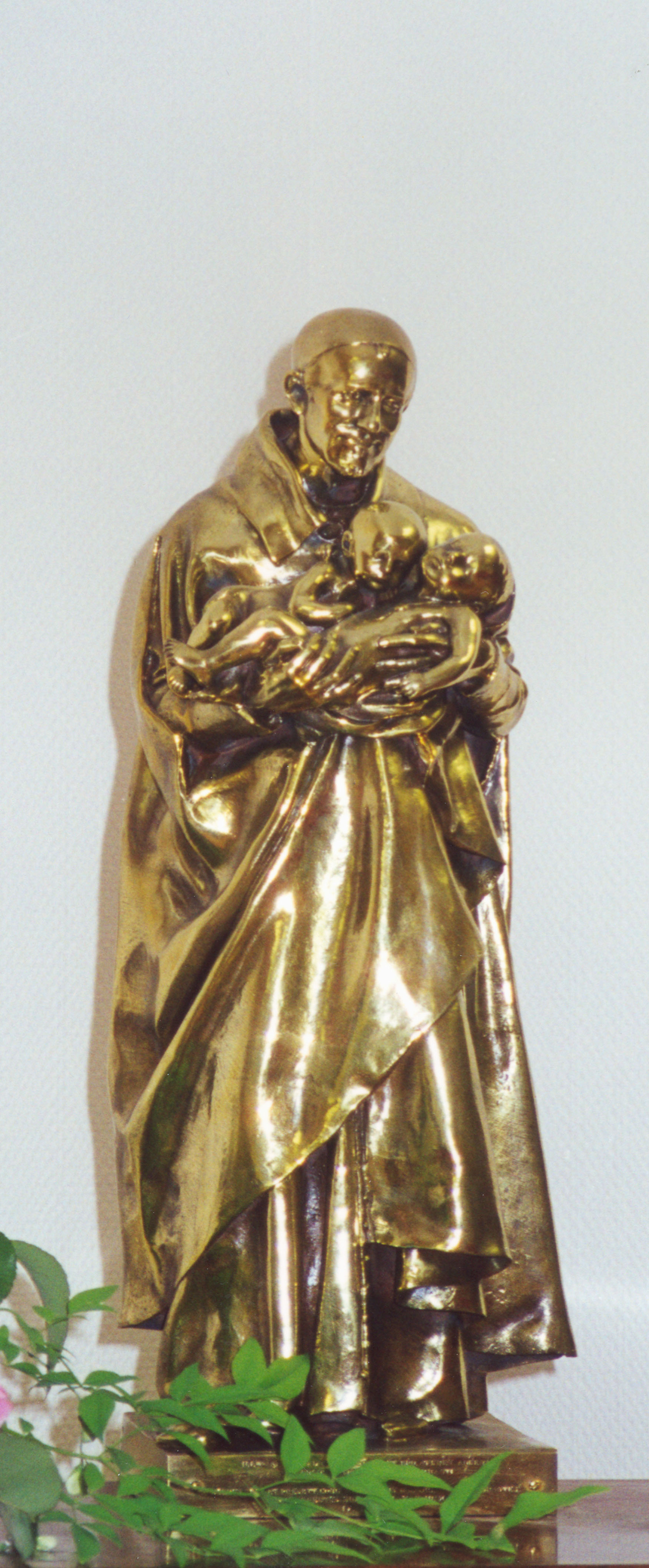 Bronze; Vincent de Paul, standing, cassock, cape, skullcap, holding two sleeping children; based on Falguiere model; original in guest house, Berceau