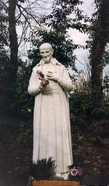 Outdoor statue, Vincent de Paul holding roses, Buglose