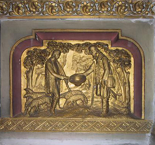 Frieze on altar; young Vincent de Paul, shepherd, gives alms to handicapped man; sheep, trees, mountains; original in Buglose