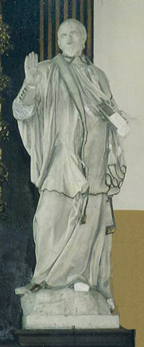 Stone, damaged; Vincent de Paul, standing, cassock, short surplice, stole, skullcap; original in St. Leu, Amiens