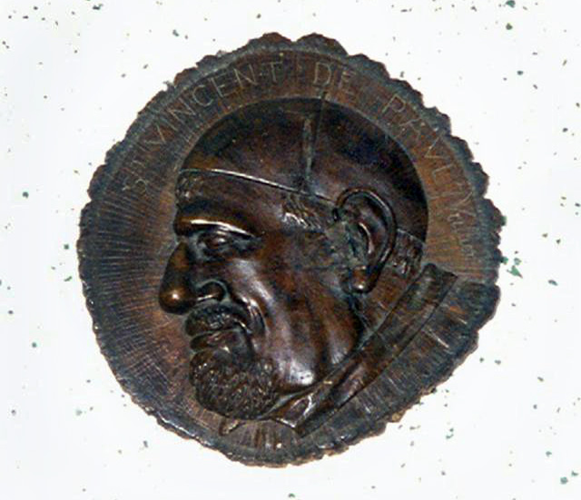 Wood medallion, VIncent de Paul, profile, skullcap, name above; original in Vincentian house, Dax