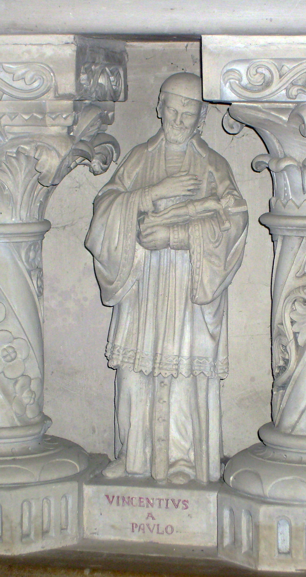 Carved stone altar frontal, Vincent de Paul, cassock, surplice, skullcap, contemplating crucifix; Latin text below; original in church, Saulieu