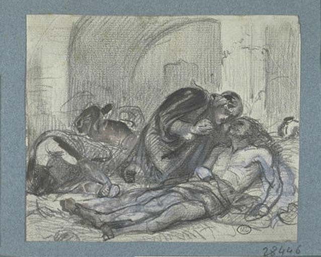 Pencil sketch, helping the sick or wounded; may be copyrighted; location not given