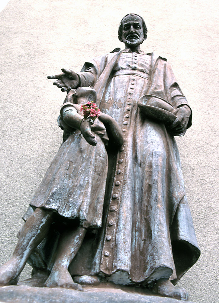Bronze statue, Vincent de Paul with child; Vincent, standing, cassock, cincture, mantle, holding hat; location of original not determined