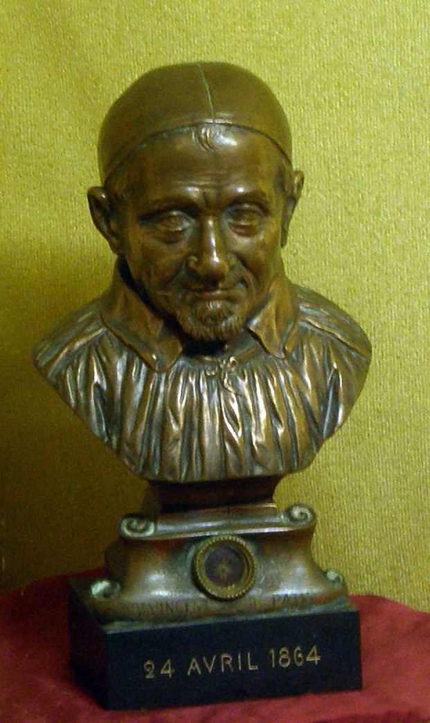 Bronze bust, Vincent de Paul, cassock, surplice, skullcap; on base with round reliquary, date of dedication of monument in Dax; original at Berceau