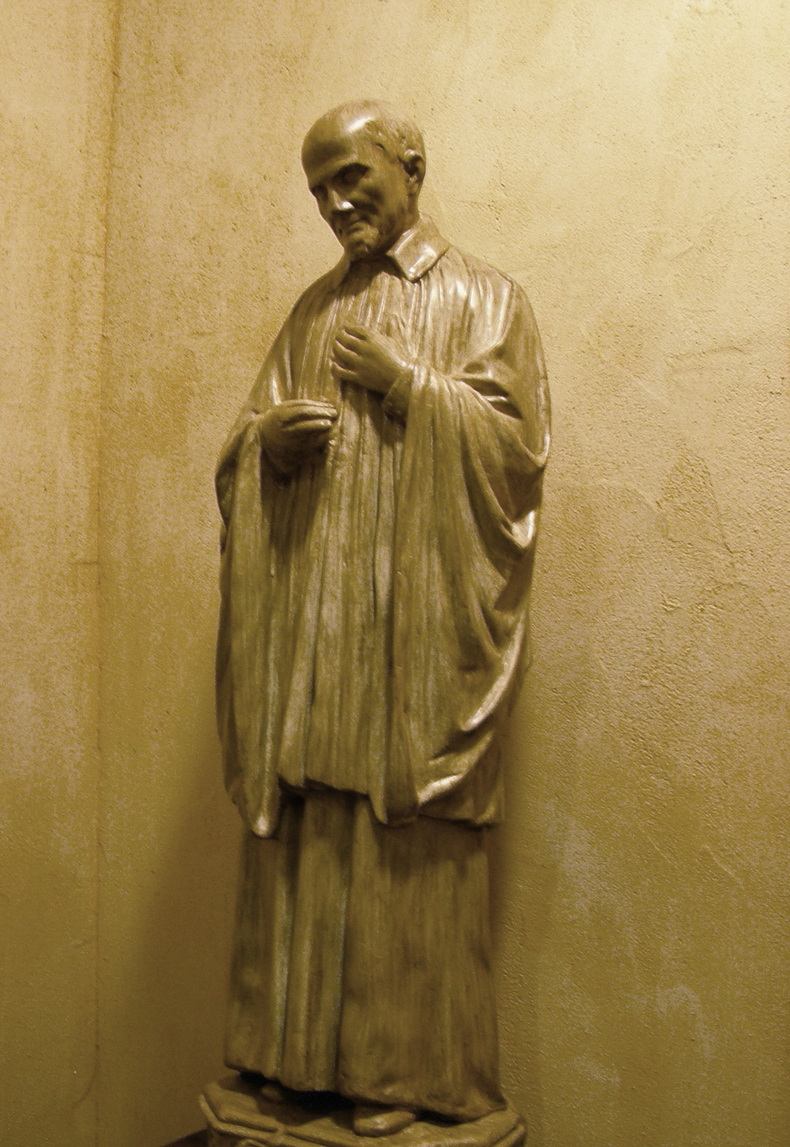 Plaster statue, Vincent de Paul, standing, cassock, surplice, formerly holding a crucifix which he contemplates; original in Daughters of Charity house, rue du Doyenné