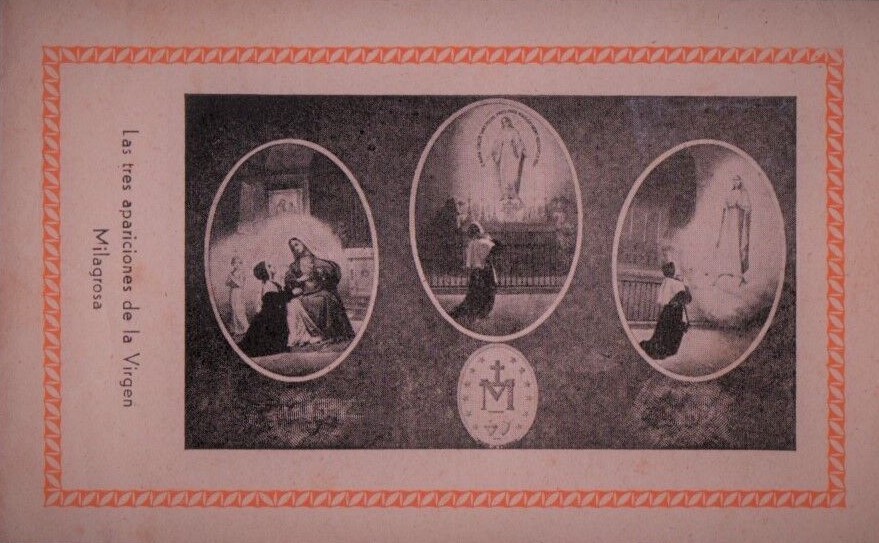 Text: The three apparitions of the miraculous virgin."