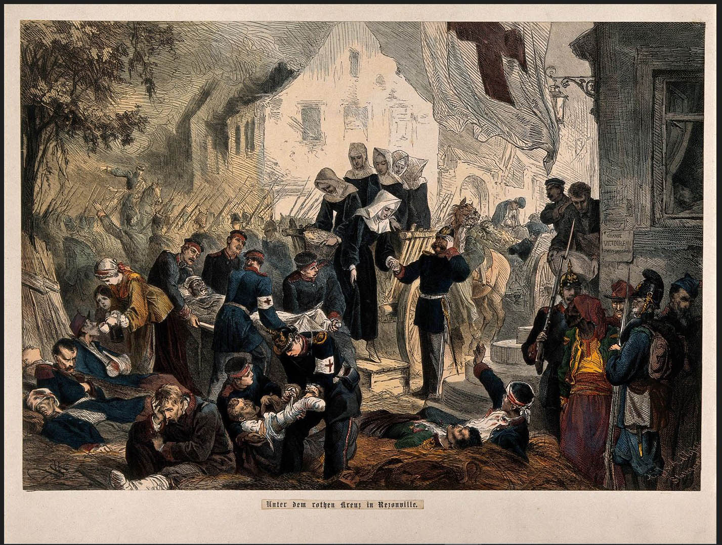 "Under the Red Cross." German Sisters of Charity; colored woodcut by Adolf Closs