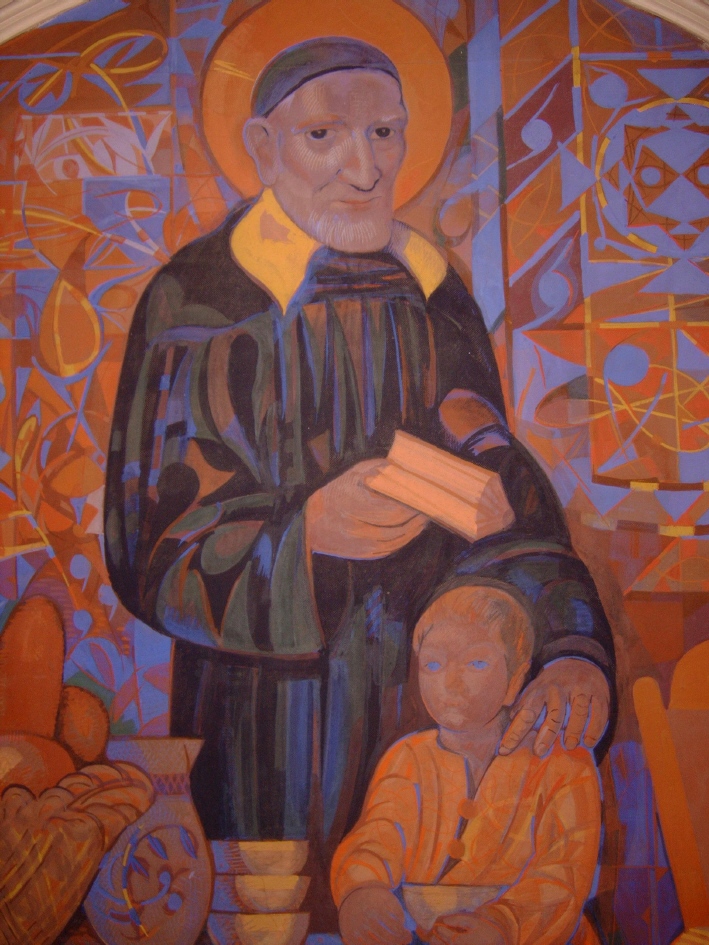 Painting; Vincent de Paul, standing, cassock, skullcap, holding book; hand on a child, food on a table; original in Netherlands with Brothers of Charity, location unknown