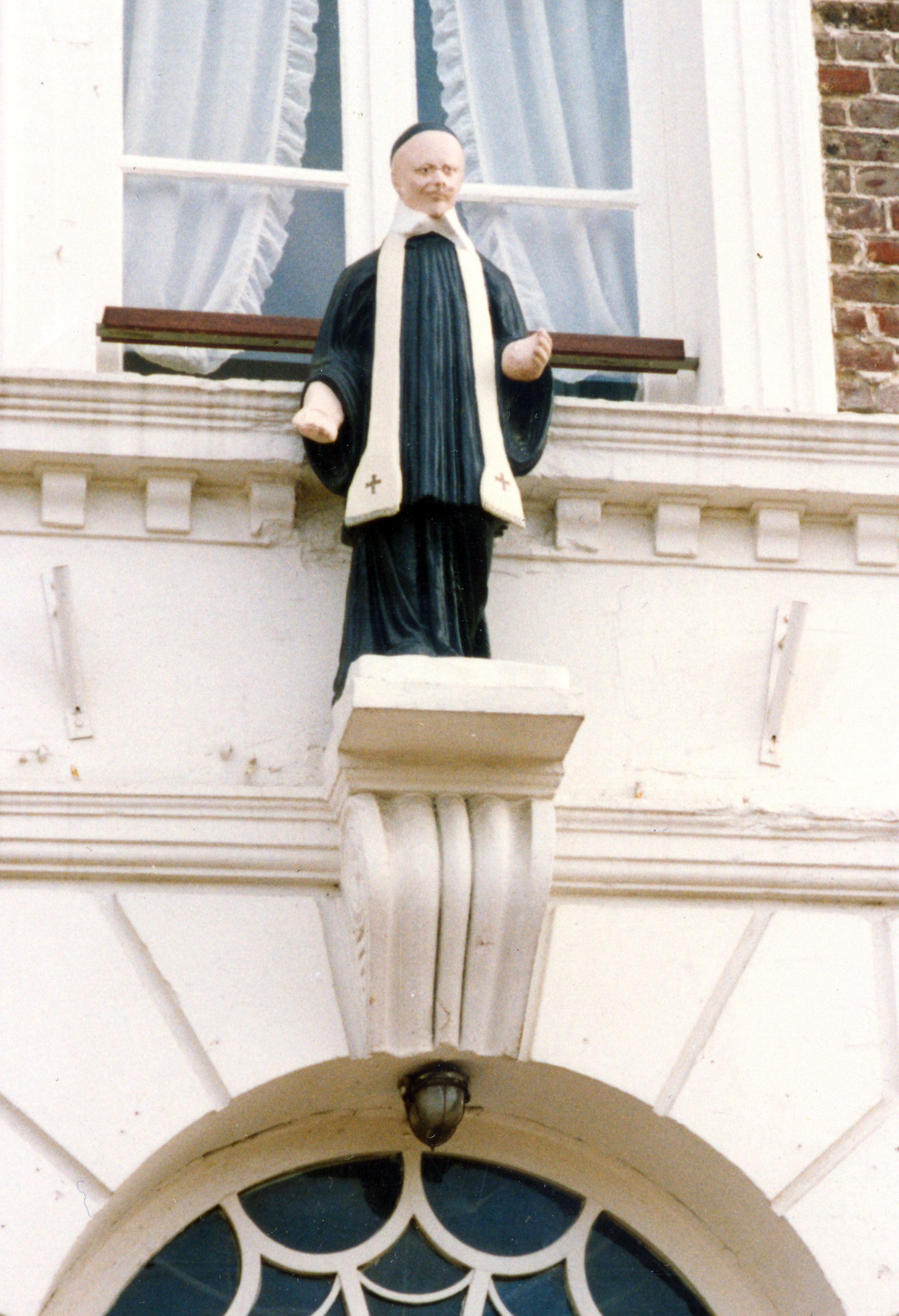 Stone statue; Vincent de Paul, standing, cassock, black surplice, white stole, skullcap; perhaps missing crucifix in left hand; location of original unknown; photograph 034 in Gunth collection, Paris