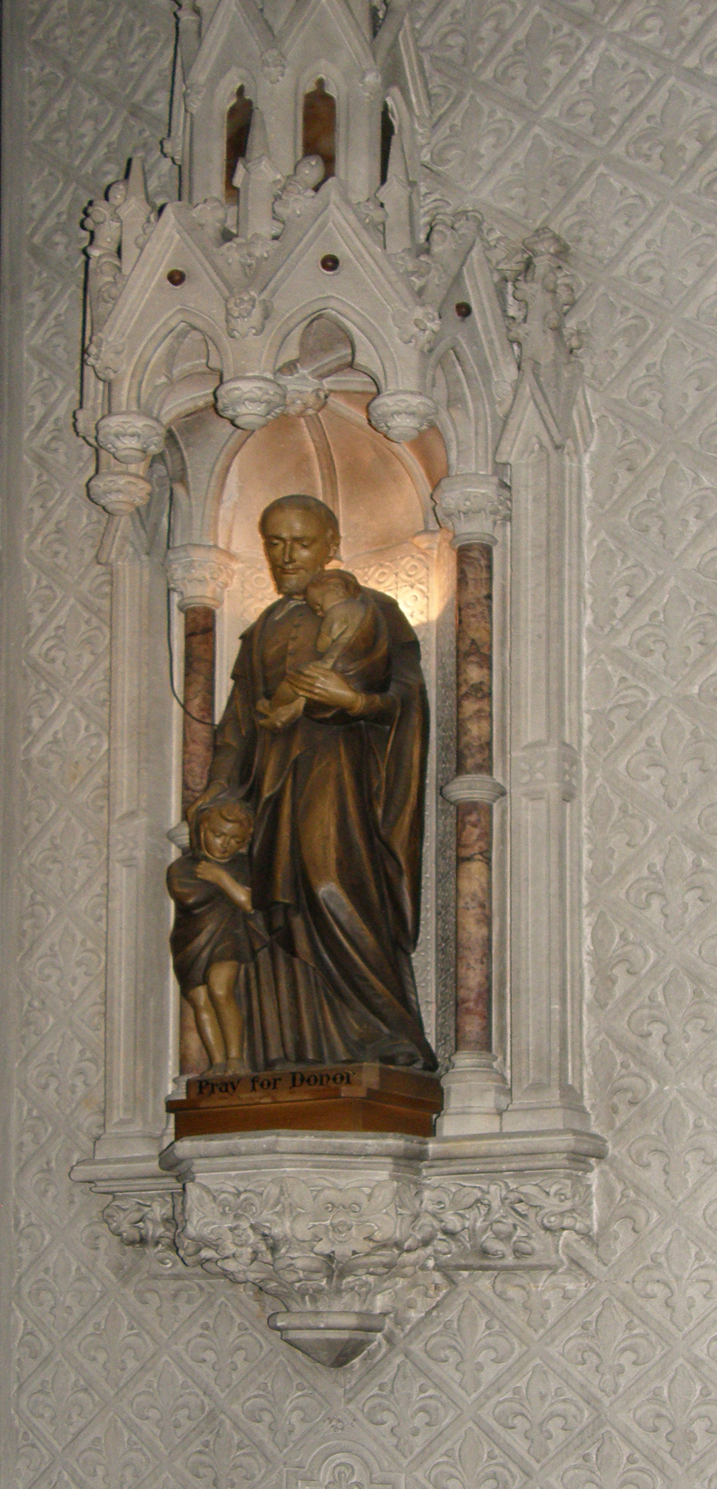 Carved wood; Vincent de Paul, standing, cassock, mantle; with two children; at St. Peter's, Phibsborough, Dublin