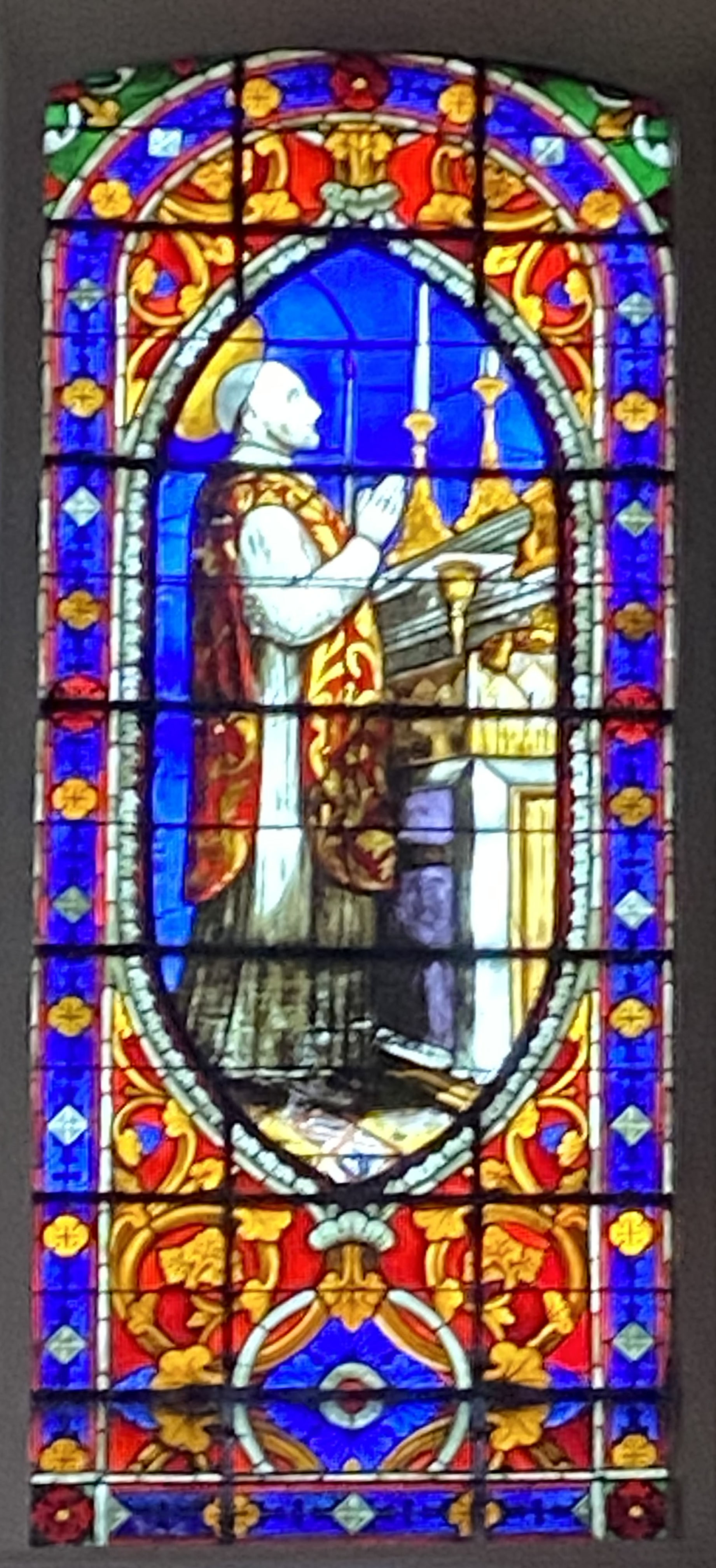 VdP celebrating Mass, rarely depicted; referring to vision of the globes