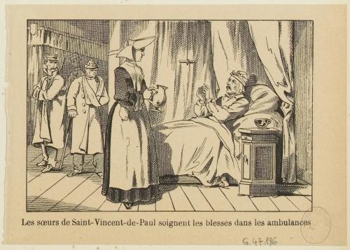 Text: The sisters of SVdP care for the wounded in the field hospitals