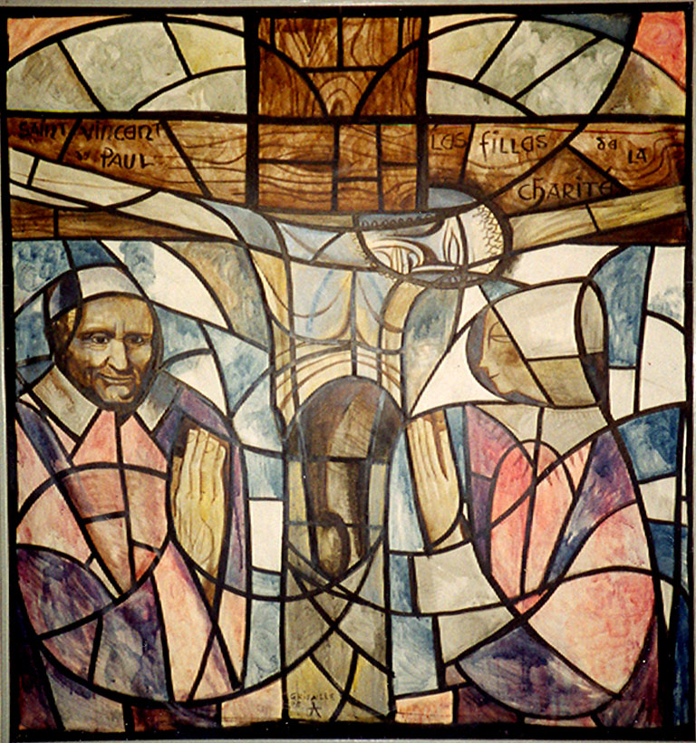 Vincent de Paul, hands folded, beneath crucifix, with Marguerite Naseau, pioneer Daughter of Charity. They met in Villepreux. Original in Presbytère, Villepreux.