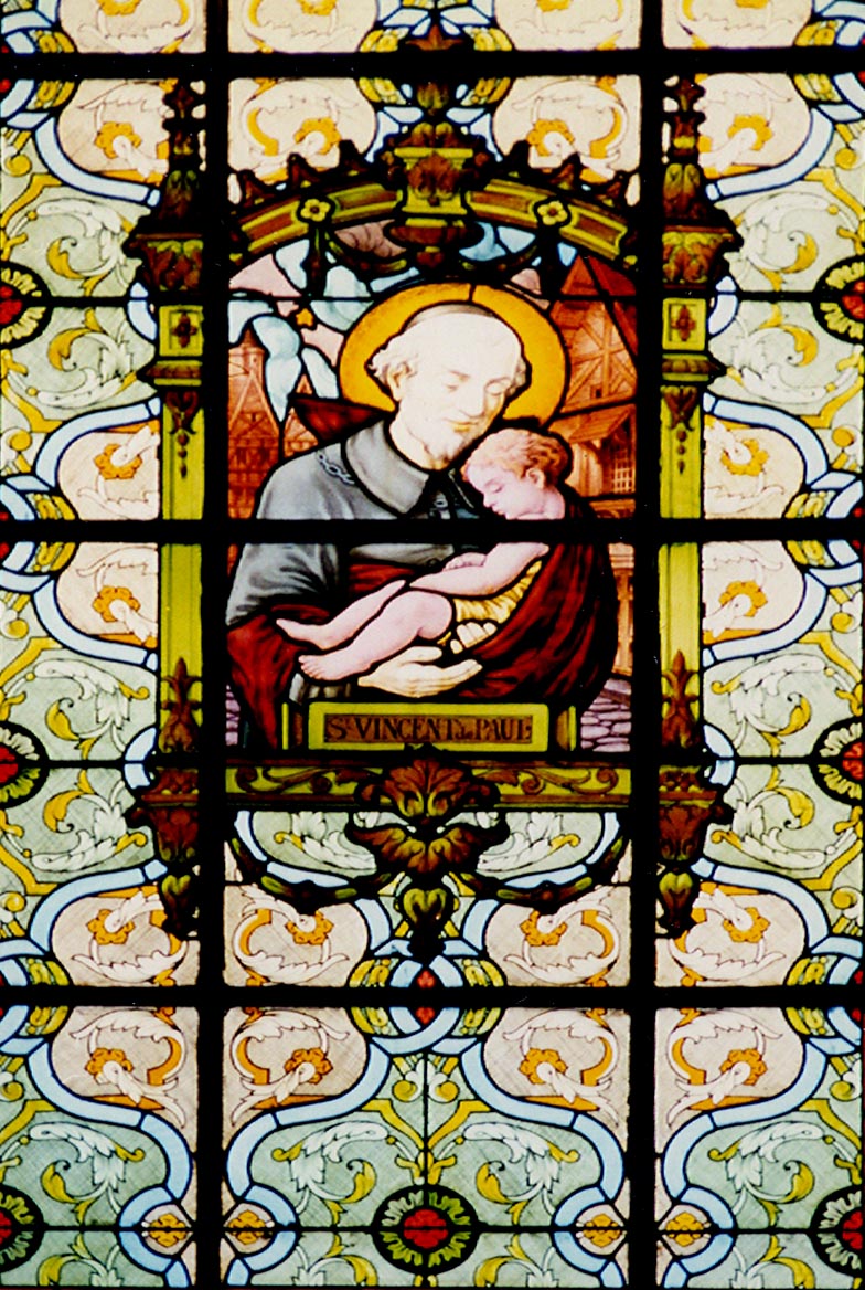 Bust of Vincent de Paul, holding sleeping infant; wooden houses in background. Original in parish church of Genevilliers.