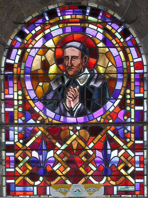 Vincent de Paul, bust, hands clasped in prayer, in round frame; fleurs de lis below; dated 1950. Original in parish church, St. Cheron.