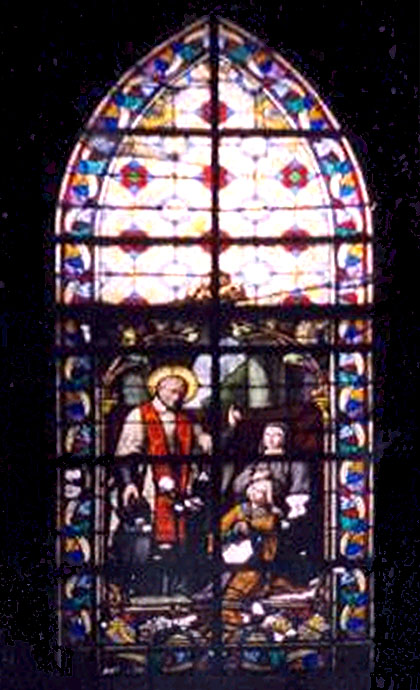 Vincent de Paul, Louise de Marillac (perhaps), a girl; original, perhaps in parish church, Geaume. Window in poor condition.