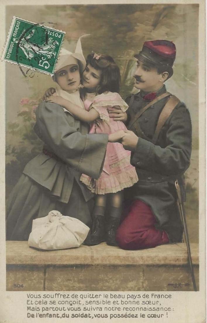 Text: You suffer in leaving the beautiful country of France. And, sensitive and decent sister, this is known. But everywhere our thanks will follow you, from the child, the soldier. whom you keep in your heart.