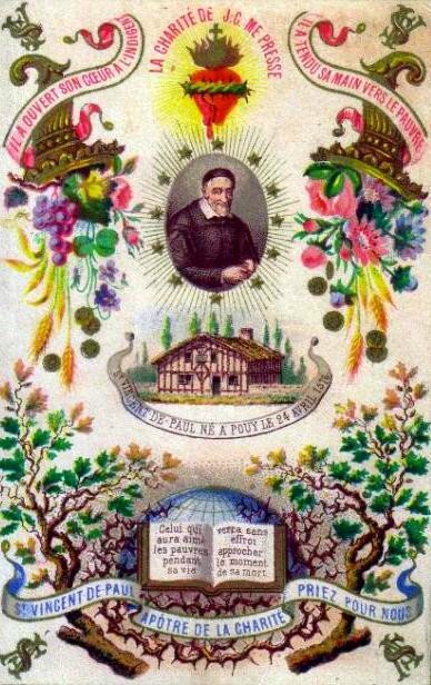 Vincent de Paul, Ranquines house, text: Apostle of Charity, pray for us; flaming heart of charity, texts, oak branches, thorns; book: "He who loves the poor during life, will fearlessly see the moment of his death approaching."