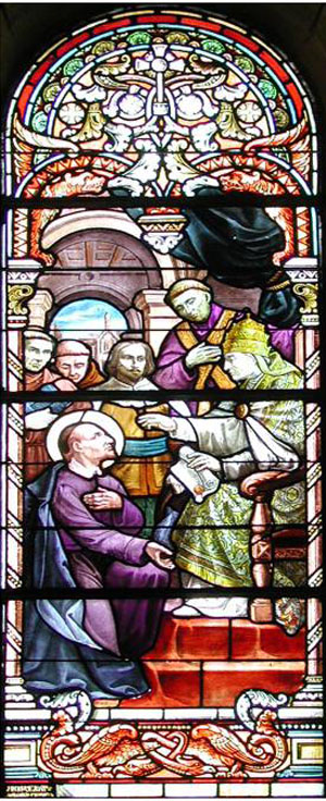 Symbolic view of Vincent de Paul presenting request to found the Congregation to the pope. Original in church, St-Vincent-de-Paul (Landes), formerly Pouy.