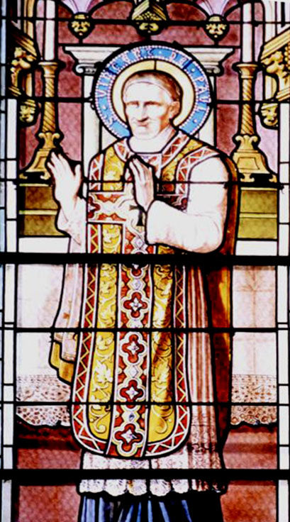 Vincent de Paul in mass vestments, short alb; gesture of "The Lord be with you." Original in Labouré side chapel, parish church of Fain-les-Moutiers