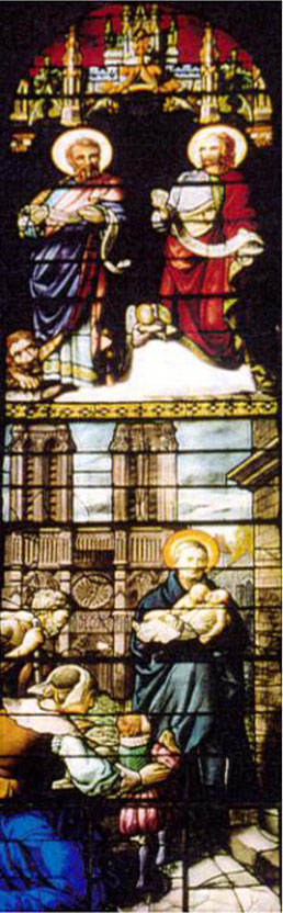 Vincent de Paul with two infants (modeled on Falguieres statue), with poor persons in front ot parish at Etrechy; two apostles above.