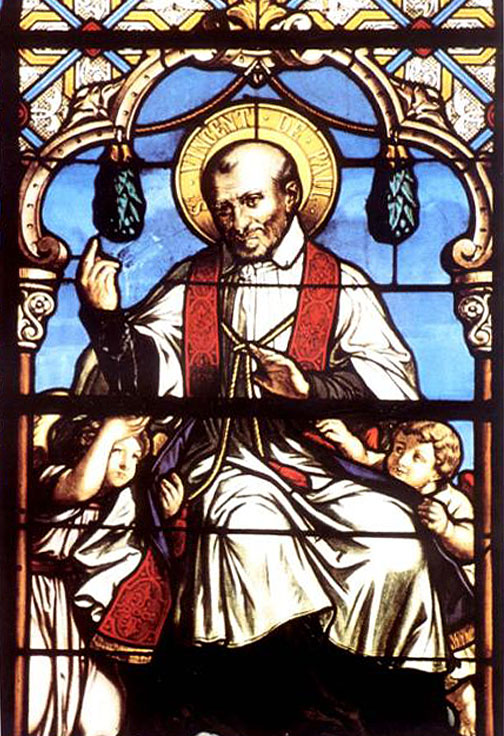 Vincent de Paul in cassock, surplice, red stole; attended by angels in glory; right hand raised. Original in chapel of Berceau of St. Vincent de Paul; based on beatification painting