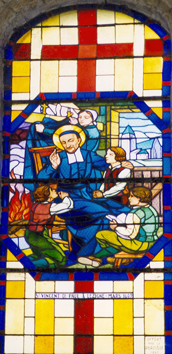 Vincent de Paul, with diocesan collar, fell from a horse into a stream; woman dries his cloak at the fire and he gives catechism lesson; church visible through window