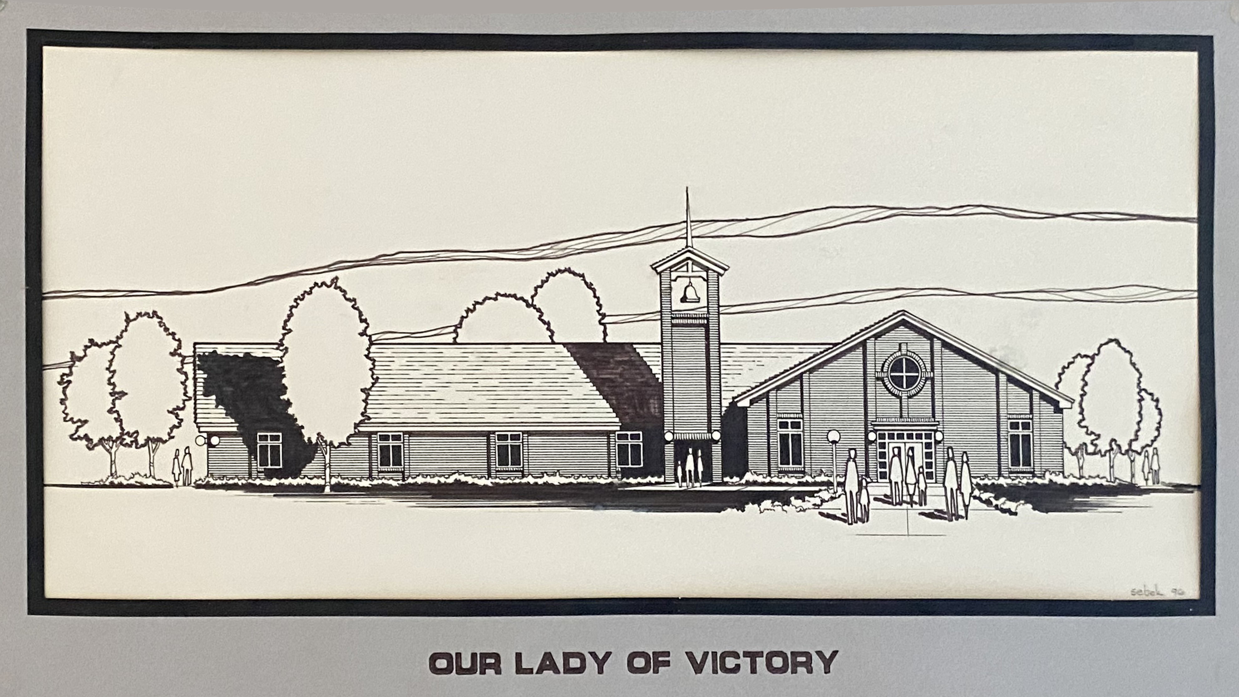 L to R: Hall, bell tower, church