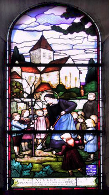 Vincent de Paul, with children, plants tree; shown for many years in the parish garden