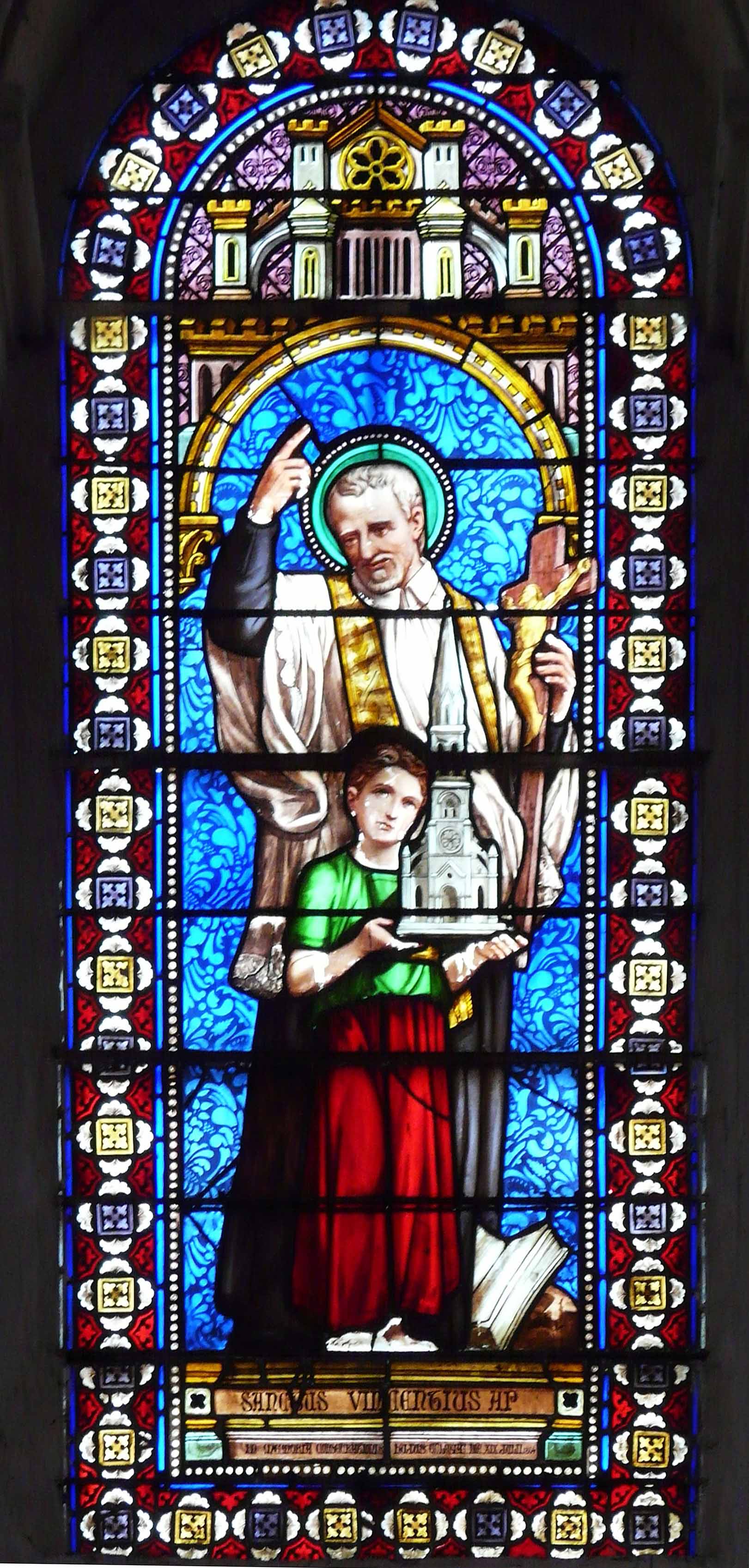 Vincent de Paul, Bracci model: cassock, surplice, stole, halo, gesturing to crucifix; book at his feet; text below in Latin: Sanctus Vincentius AP (a Paulo); internet image