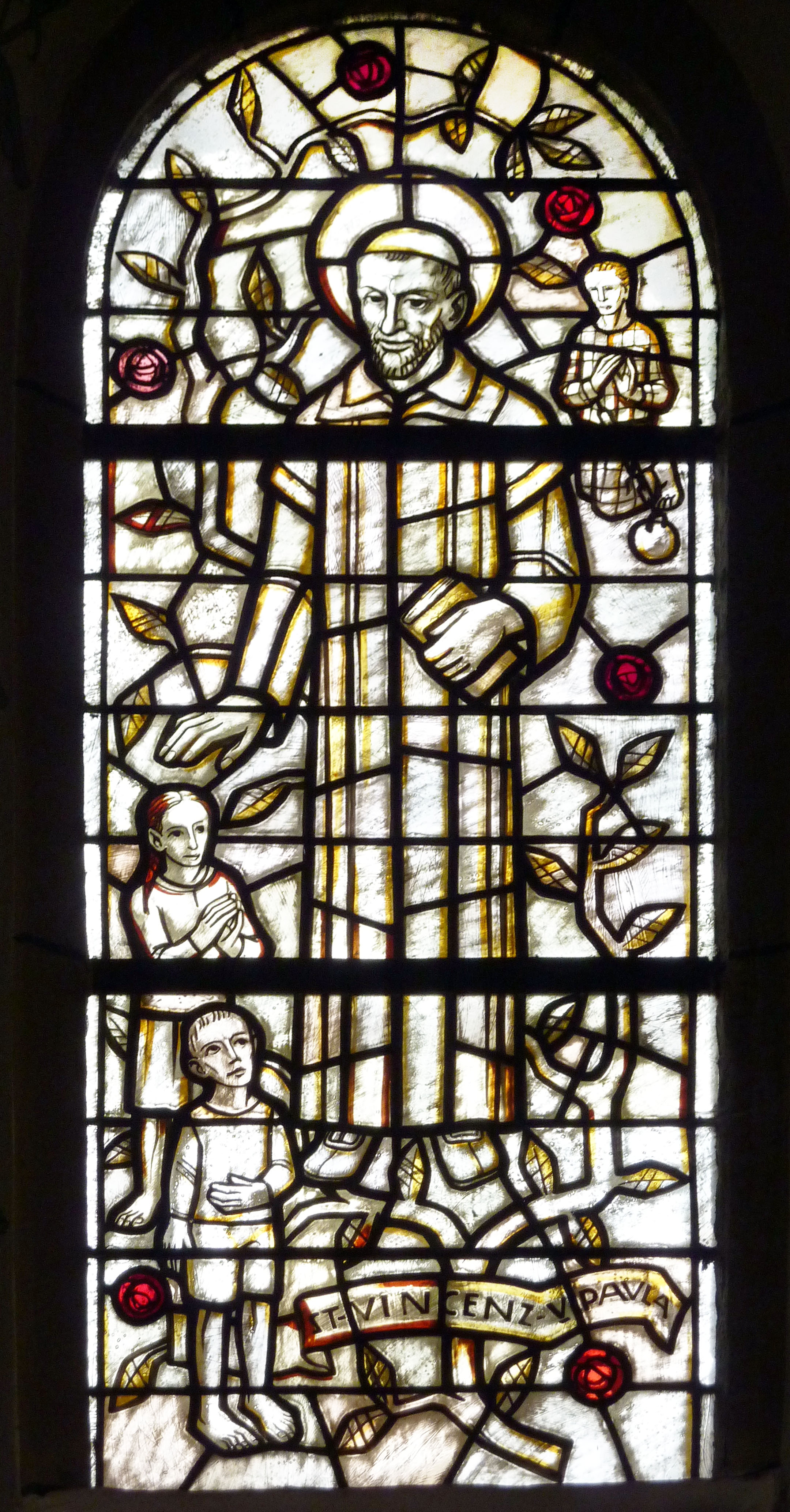 Vincent de Paul, standing, cassock, mantle, skullcap, halo; three children; name in German; in St Hubertus church; by Reinhard Hauke; internet image