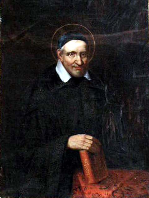 Oil painting; Vincent de Paul, in cassock and cape, holding book on table covered with tapestry, in a library; original in Mairie of Aire (Landes)