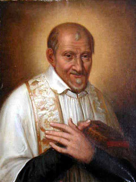 Oil painting, Vincent de Paul holding or presenting a book (rules?); original in Vincentian house, Dax.