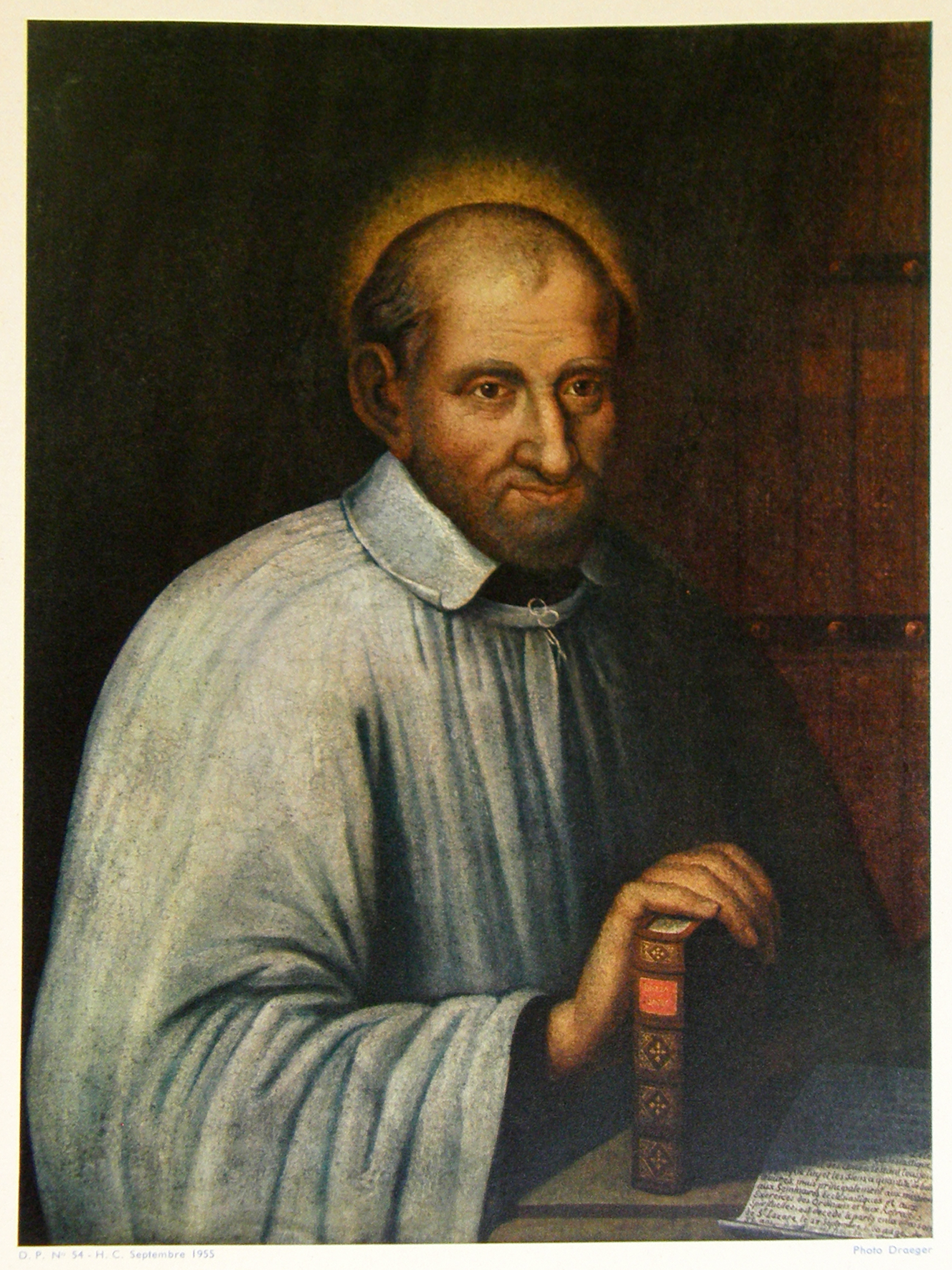 Vincent de Paul, in cassock, full surplice, no skullcap; holding book; document on table; books on shelves behind; probably a second version of a painting in the CM provincial offices, Paris