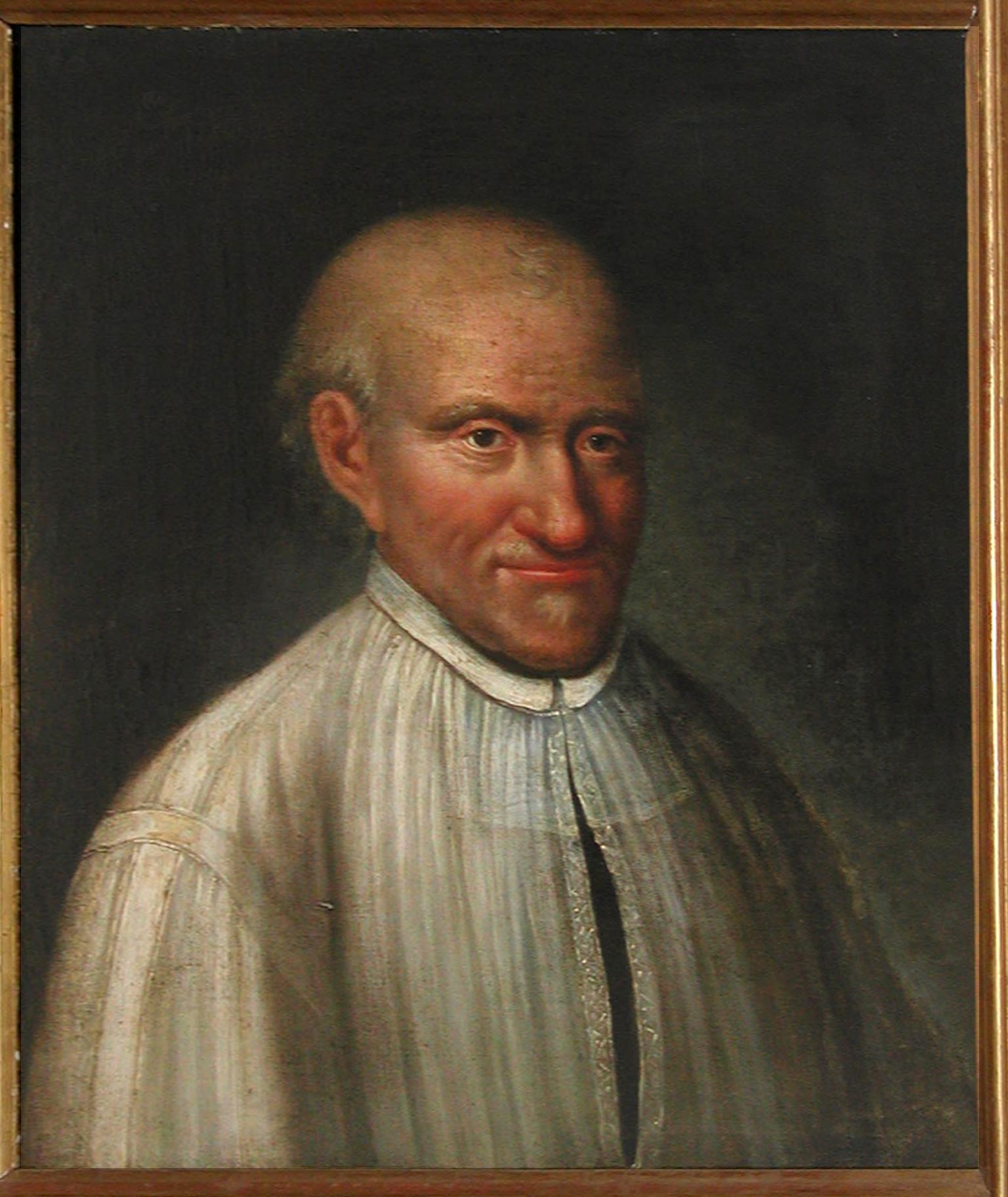 Oil painting; Vincent de Paul in surplice, shown mostly bald, chin whiskers; copy of Moutiers St. Jean portrait; original in Vincentian mother house, Paris